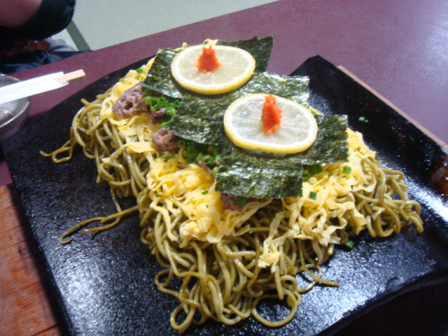 瓦そばとは、山口名物で、屋根瓦で茶そばや牛肉を焼いたものを