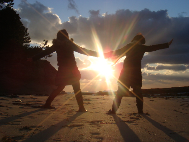 お風呂の前に3人で海沿いを散歩、2人の青春ショットをダンナに