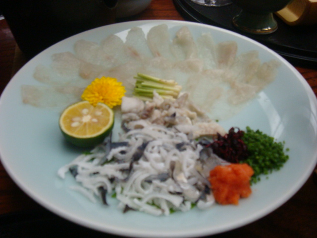夜はピンボケですがふぐ刺しを含むお料理に。
