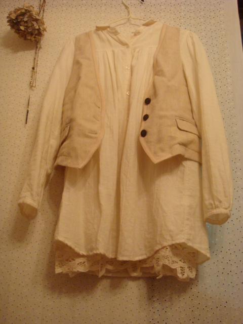 コットンウールの長め丈シャツ+麻素材のベストという、