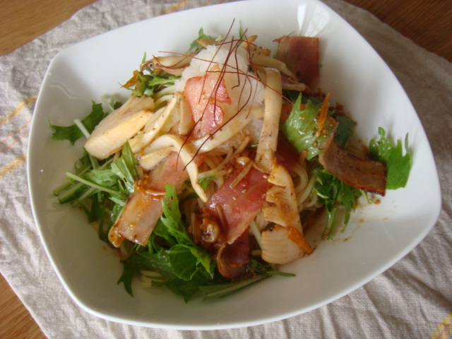 休日恒例、ブランチはさっぱり・ひやあつパスタ。