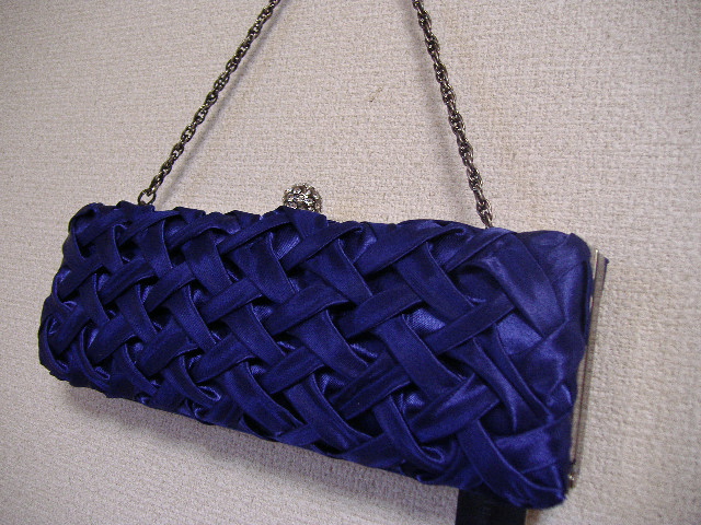 ブルーのクラッチはつやつやサテンの生地がクロス状に複雑に