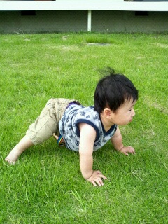 芝生がチクチクするから、外では膝つけないハイハイ…。器用やなあ~