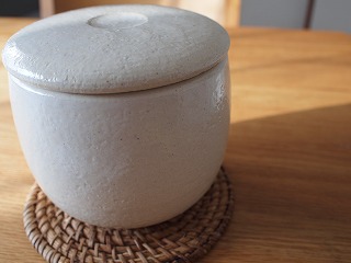 蓋つきの陶器ですね、実はこれ、おひつなんです。『めしびつころりん』というかわいいお名前。炊き立てご飯を入れて保存するもの。