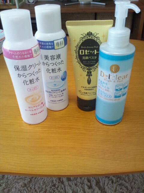 右から、detclearのピーリングジェル。色々無添加で、ピーリング部門では安くて高評価。週2で二週間使ったら、ザラザラ肌が生き返りました。