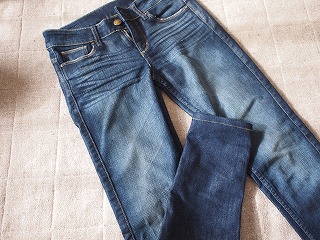 3年モノのスキニー(これまたユニクロ)がびよびよに伸びたので、新しいのを買いました。なんか濃い目の色落ちが気分だったんで、テーパードスキニーのこんなのを。