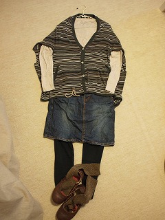 スカートをはきたいときは、ゆったりしたカーディガンにデニムスカート+レギンス。スカートだけってのは、ママにはちょいと厳しいね。もう少ししたら、ショートブーツを合わせたい!