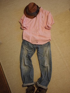前開きできるシャツもよく着ます。こちらパステルピンクのラルフローレンのシャツ(古着)。デニムと相性◎です。
