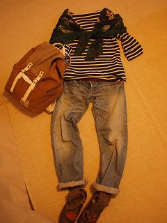 今年はスカーフが大活躍です。パパがいないときのお出かけには、リュックがほんとに重宝します。マザーズバッグクルーズのその後も、また記事にしよっかな。ボトムは6年前に買った、blondyのゆるめダメージデニムをロールアップで。