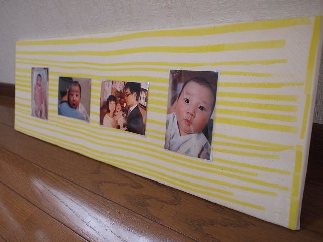 実家にお世話になっている間は時間に余裕があるので、息子が寝てる間にちょこちょこいろんなものを手作りしてます。下手だけど、工作も裁縫も大好きなもんで。夏休みの宿題って感じがしますな(笑)子供の写真をかわいく飾りたい!と思い、手作りしたのがこちら。お手製ファブリックパネルに写真を飾れるようにしました。