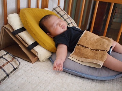 社宅ライフに逆戻りで、昼間ベビーの居場所をどうするかな、と考えてます。昼間はお座り状態じゃないと寝なくなった息子。かなり試行錯誤しましたが、今は、レンタルしたベビーベッドにこういうのを手作りして斜めに寝かしてます。