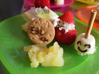 今回も、たくさんの美味しいランチに、しめはクリスマスケーキ!子供用にはこんなにかわいい、水切りヨーグルトのケーキ。添えられたお菓子や果物も持ち寄りなんです。