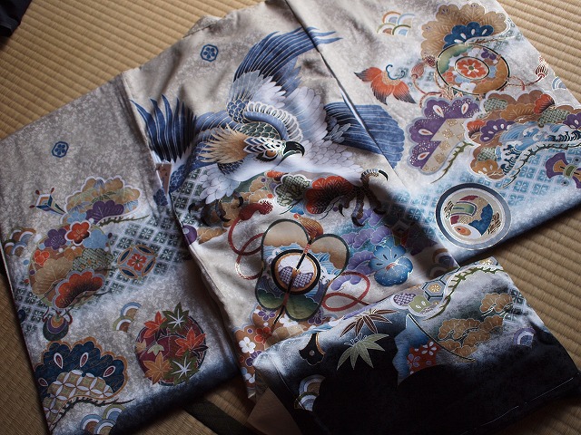 息子のためにうちの実家が用意してくれた着物。妊娠中に一緒に選びに行き、産まれたあと顔を見てから母が買いに行ってくれました。渋いグレイに裾は黒、鷹の柄です。ちょっと変わった色目だけれど、シックでとっても気に入りました。色白そうちゃんにもぴったり。旦那さんのうちの家紋を入れてもらっています。